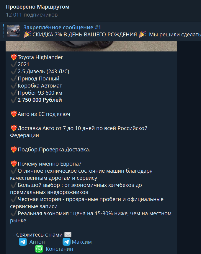 В постах на канале демонстрируют различные автомобили, их характеристики и цены, а для подробностей просят писать в Телеграмм или WhatsApp.