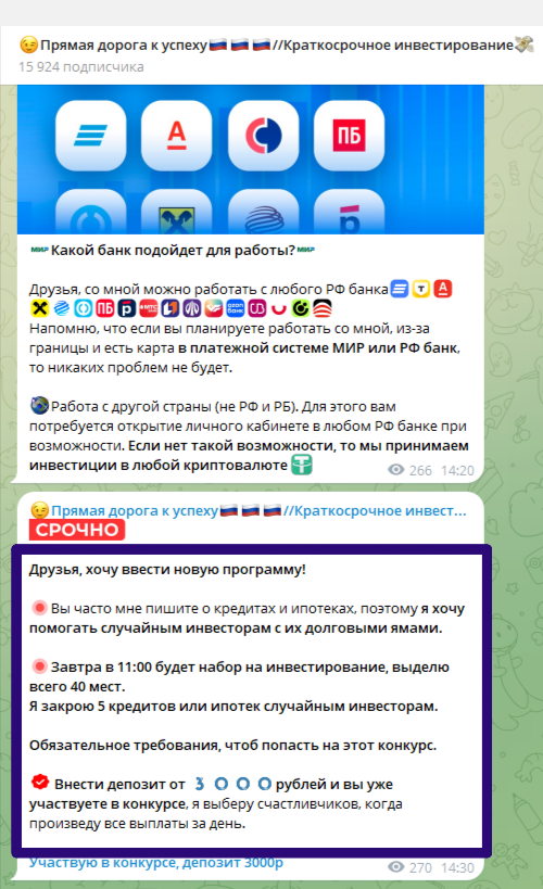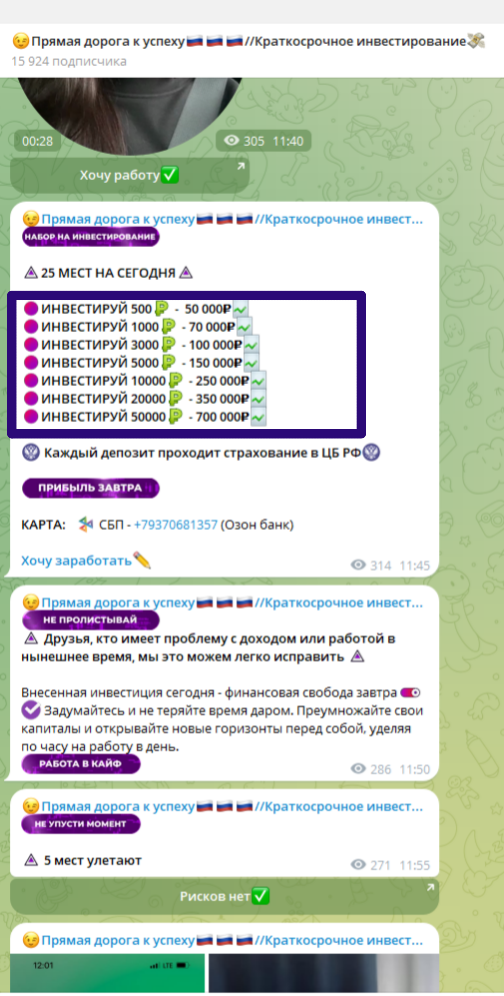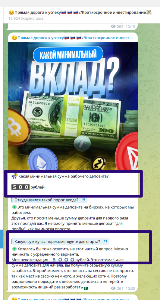 Минимальный взнос, указанный в сообществе — ₽500. Правда админ телеграм-канала «Прямая дорога к успеху Краткосрочное инвестирование» пишет, что для более ощутимой прибыли рекомендуется вкладывать не менее ₽5,000. В паблике регулярно проходит набор в «команду инвесторов», которая состоит из 25 человек.
