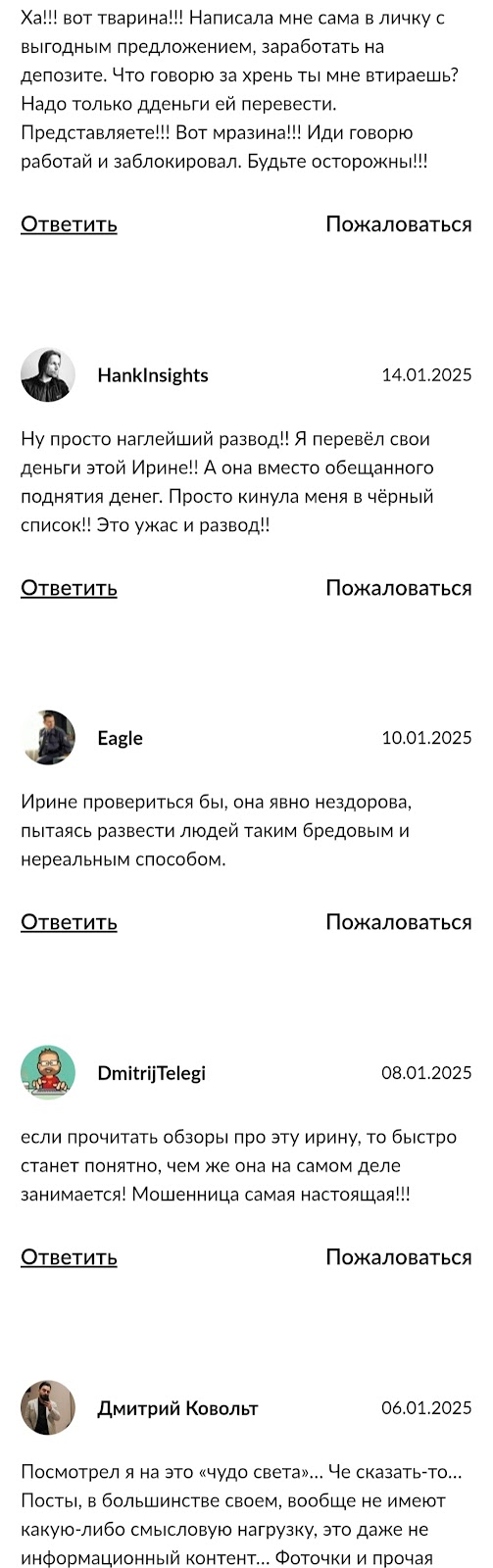 • Об Ирине отсутствует какая-либо информация касательно её финансового образования. Следовательно, решение взаимодействия с ней нужно принимать на свой страх и риск.
