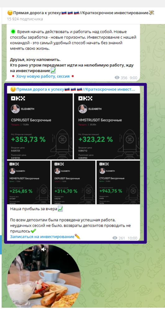 Тем не менее, в канале постоянно публикуют скриншоты только успешных сделок, где суммы прибыли зашкаливают. Интересно, что на этих «доказательствах» нет дат проведения сделки или других подробностей. Посмотреть портфель инвестиций не выйдет, потому что такой возможности администрация не дает.