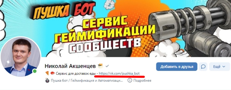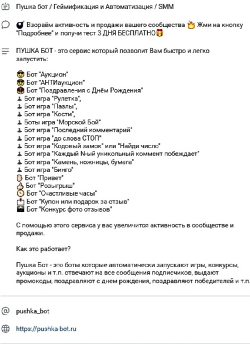 Для примера, вот сервис по доставке еды продвигаемый Николаем, в ссылке которого тоже указан Pushka bot. Вот полный список таких ресурсов, опубликованный самим автором.