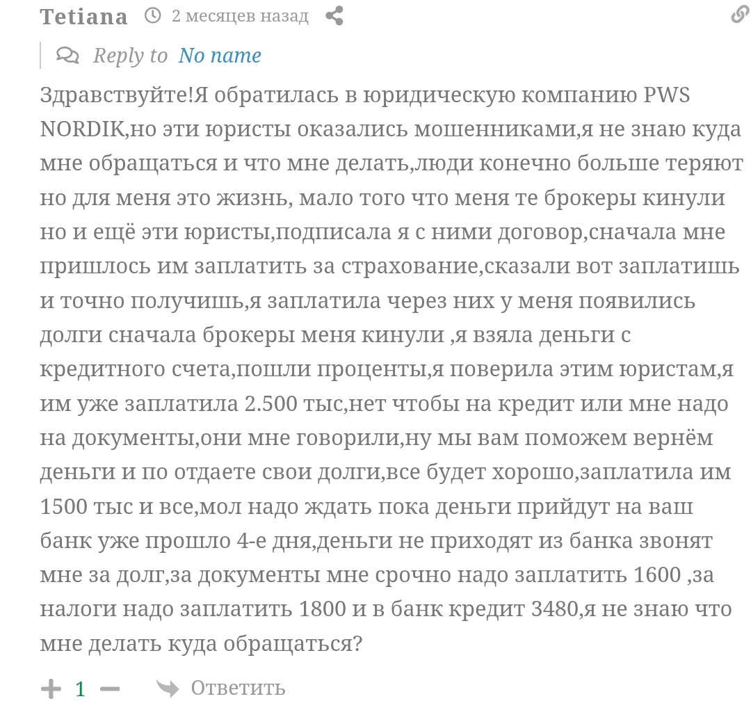 Свидетельств легальной деятельности юридической конторы ПвсНордик мы не нашли. Все известные факты говорят, что попытки вернуть утраченные средства через эту фирму приведут только к увеличению убытков.