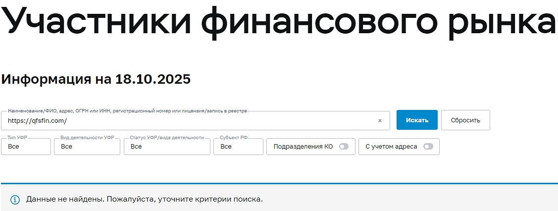 Цифры биржи «КьюФс Финанс» впечатляют, ведь 1 000 000 клиентов якобы совершают здесь 5 000 000 защищенных транзакций в месяц. Отзывы о Qfs Finance заставляют усомниться в правдивости статистики, ведь счетчик комментариев от Google показывает 22 100.Оставшиеся 970 000 трейдеров решили промолчать либо их просто не существует, тем более что в России у фирмы «КьюФс Финанс» нелегальный статус. В реестре ЦБ РФ сведений о ней нет, потому проблемы с платформой Qfs Finance скорее всего никто не решит.