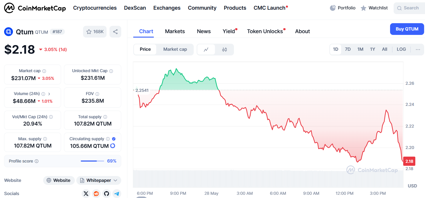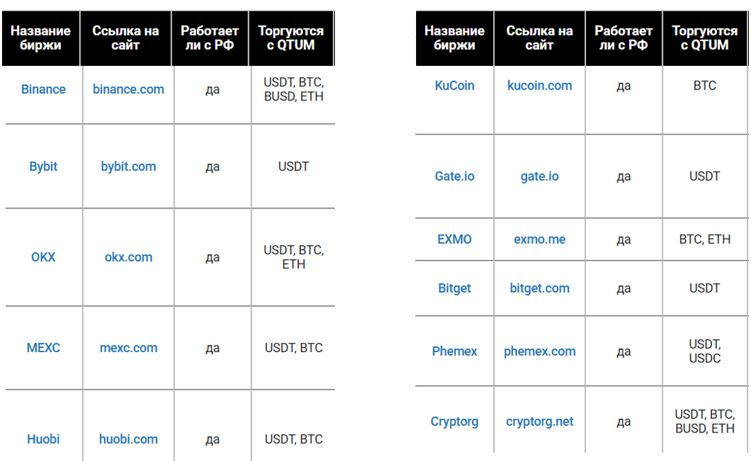 Qtum крипта доступна на ведущих биржах, таких как Binance, OKX, Huobi, Gate.io и других. Торгуется парами QTUM/USDT, BUSD, BTC, ETH.