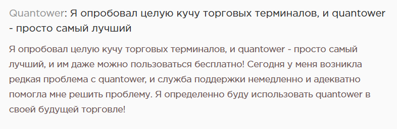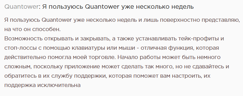 Трейдеры довольны доступным функционалом. Из сложностей отмечают только первые этапы работы, когда приходиться разбираться с навигацией и интерфейсом, но опять-таки – служба поддержки «КуанТавер» всегда готова прийти на помощь.