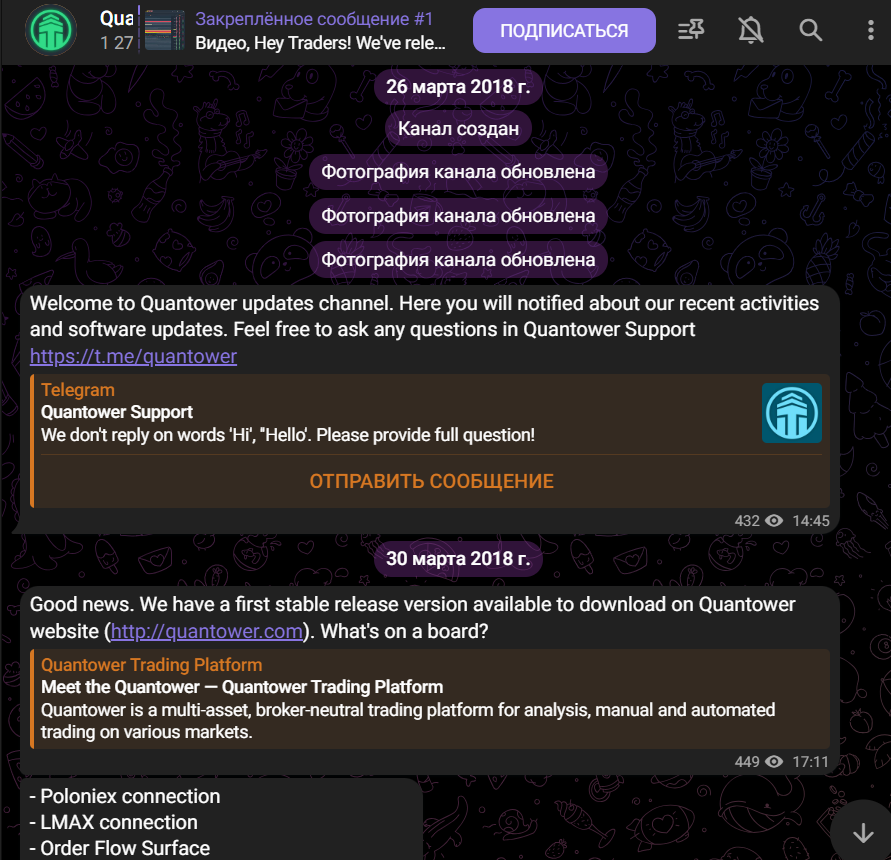 Связаться с техподдержкой можно по info quantower com, проверка электронного адреса показала, что почта реально зарегистрирована. Доступны и альтернативные каналы связи – официальные соцсети проекта.