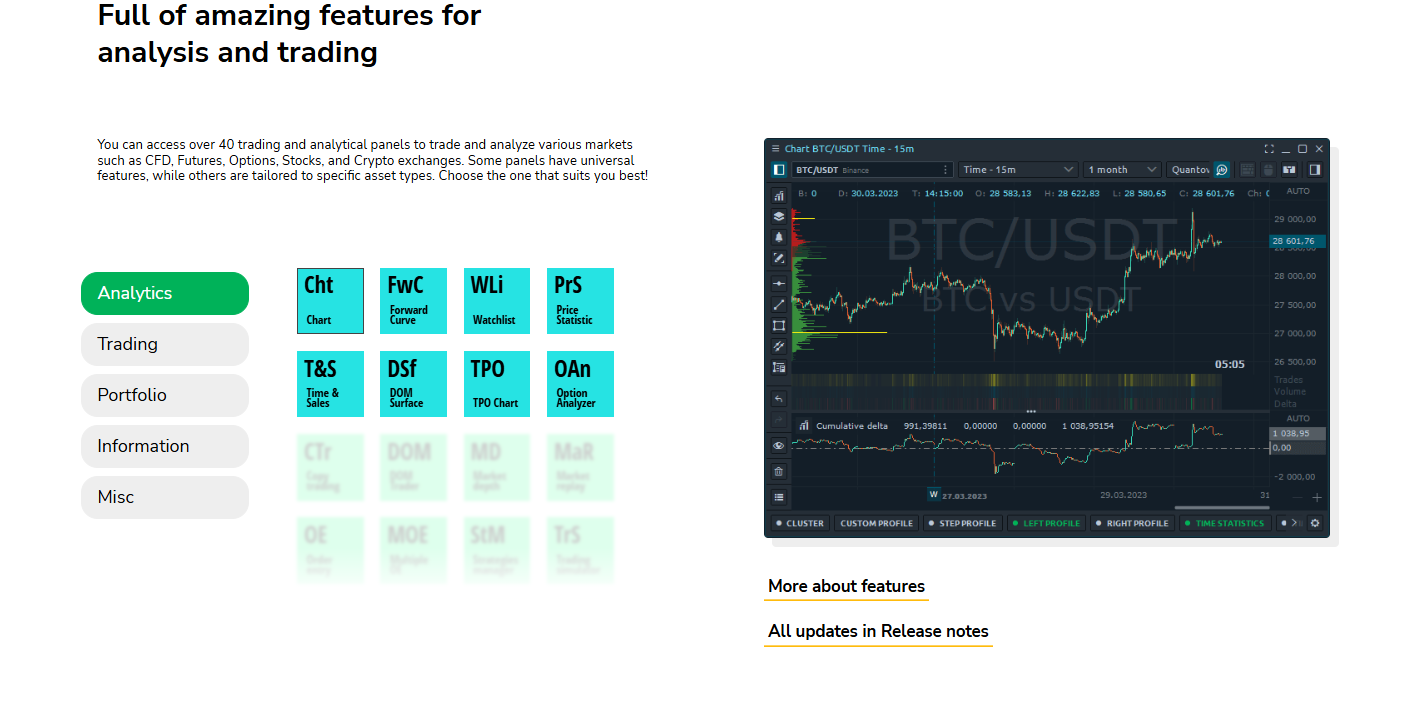 На сайте есть несколько панелей, каждая из которых отвечает за одну функцию, пользователь может организовать их в группы или связки для оптимизации рабочего пространства. Всего таких панелей более 40 для CFD, фьючерсов, опционов, акций и криптовалют, некоторые адаптированы под конкретные активы.