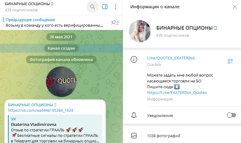 Quotex Ekaterina — телеграм-канал трейдера, в котором выходят ее личные результаты сделок. Здесь же она предлагает торговать вместе с ней на бирже и обещает делиться бесплатными сигналами. Но в интернете у данного проекта нет репутации. Сегодня мы попробуем проверить деятельность этой личности и понять, можно ли с ней сотрудничать или это ловушка.