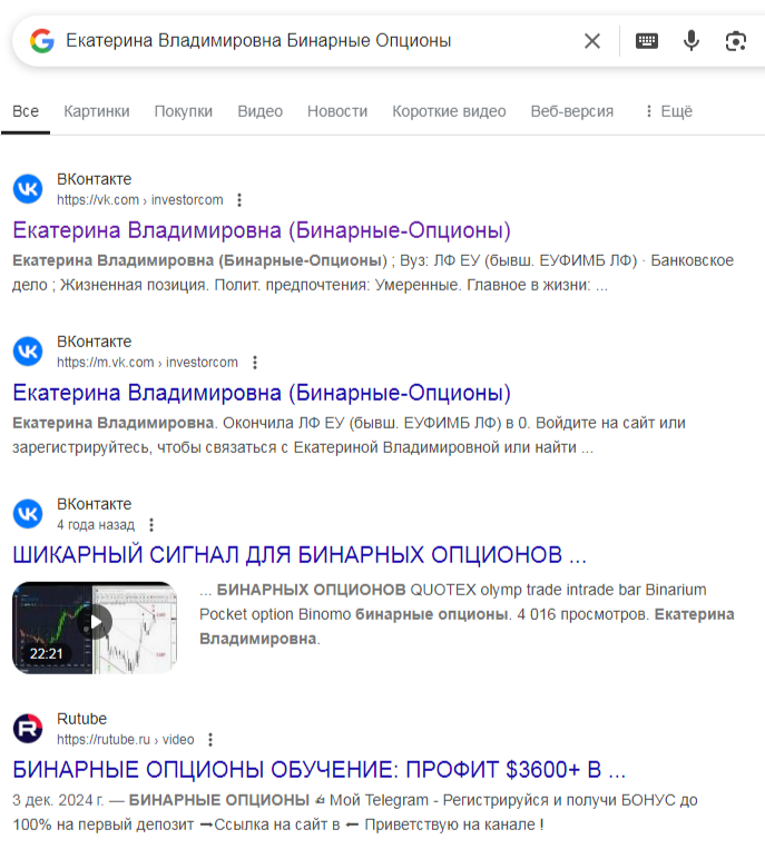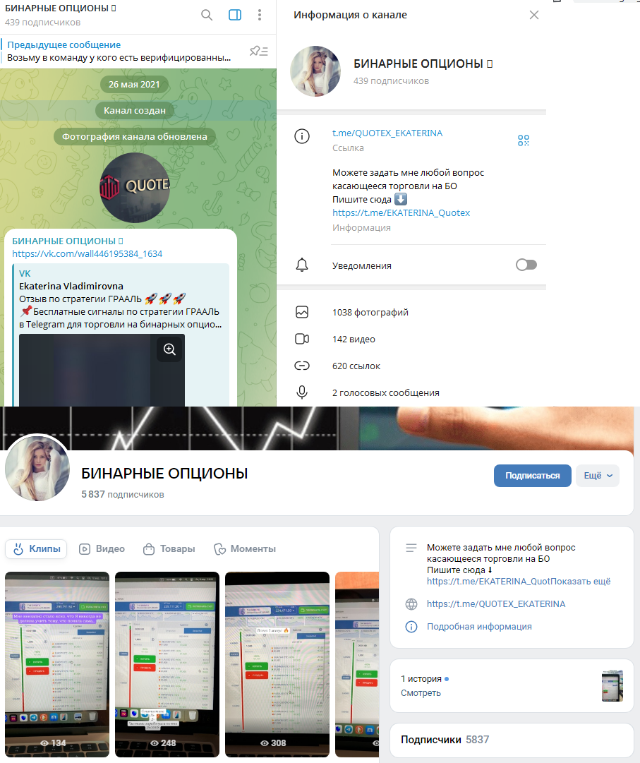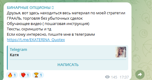 Трейдер ведет активно две социальные сети: телеграм «Бинарные Опционы Pocket option» @ quotex ekaterina и ВК «Екатерина Владимировна Бинарные Опционы» @ investorcom ru. Везде она придерживается одного и того же образа, а также заманивает работать и зарабатывать с ней в партнерстве.