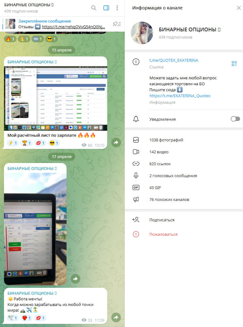 В течение нескольких лет Екатерина @ quotex ekaterina выкладывает фотографии своих успешных сделок, демонстрирует свою прибыль, рекламирует биржу и предлагает платные услуги. Также она делится текстовой статистикой, которая не подкрепляется доказательствами.Обучающей информации, бесплатных рекомендации и других базовых полезных материалов на канале «WomanTrade Бинарные Опционы» нет. Общение с аудиторией она тоже не ведет, так как комментарии закрыты.