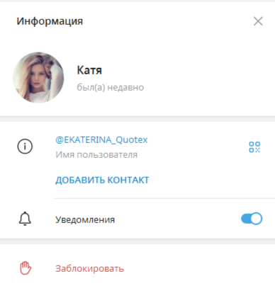 В описании канала висела ссылка на ее личку – @ quotex ekaterina. Но здесь краткая биография девушки не представлена. Стоит заметить, что в блоге она не показывает себя и придерживается полной анонимности.