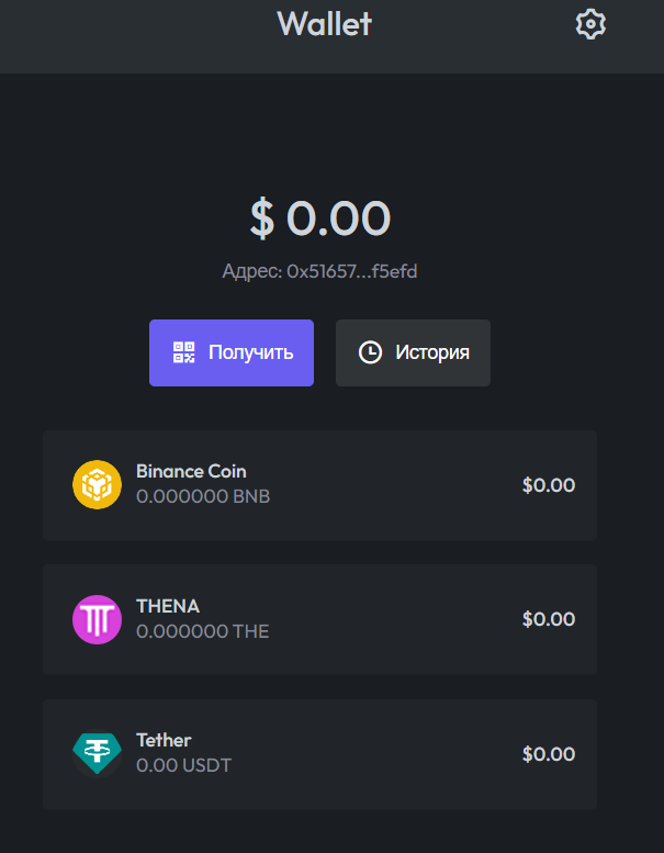 В личном кабинете RaccoonBnb Wallet нет никаких настроек, указаны только Bnb, Usdt и The, а также есть история переводов и кнопка для получения адреса кошелька.