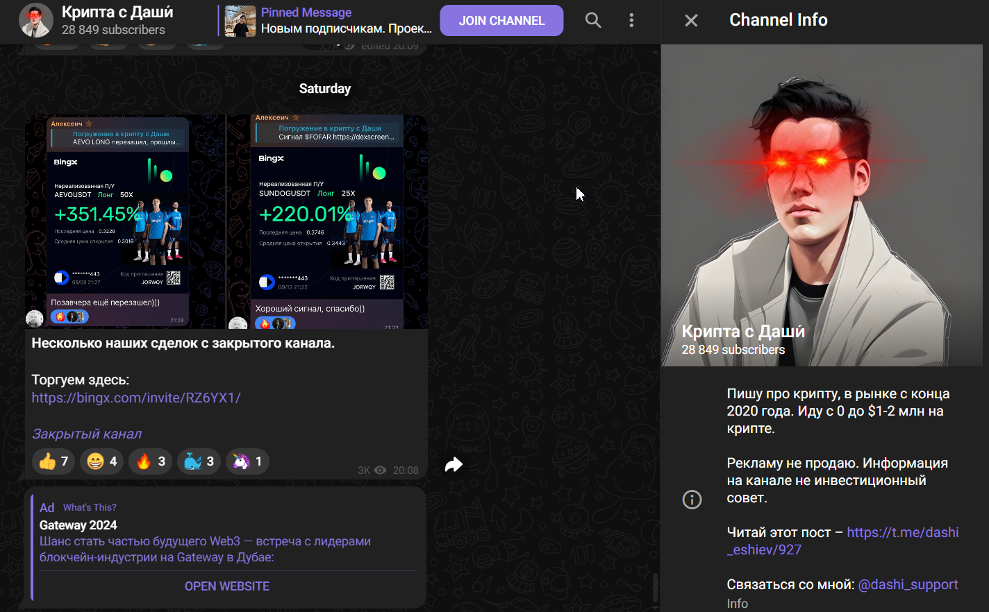 Канал Ешиев Даши в телеграм явно монетизируется на рекламе. Автор оставляет ссылки на сомнительные непроверенные ресурсы. Регистрация на них может привести к существенным финансовым убыткам. Инвестор оформил и закрытый канал.