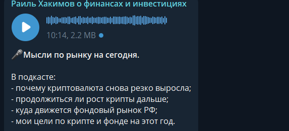 В некоторых публикациях можно найти подкасты и голосовые сообщения от автора. Там он рассказывает о ситуациях на рынке, а также о способах решения некоторых проблем, связанных с резким ростом цен или удорожанием крипты.