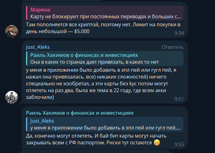 В сети о Раиле Хакимове отсутствуют мнения, так что определить качество обучения из телеграмм-канала становится сложнее. Но в комментариях под записями можно встретить положительные отзывы о рекомендуемых проектах, как например о кошельке для крипто-карт PintoPay. Пользователям удается без проблем зарегистрироваться, но слететь счета могут в любой момент из-за отсутствия верификации.