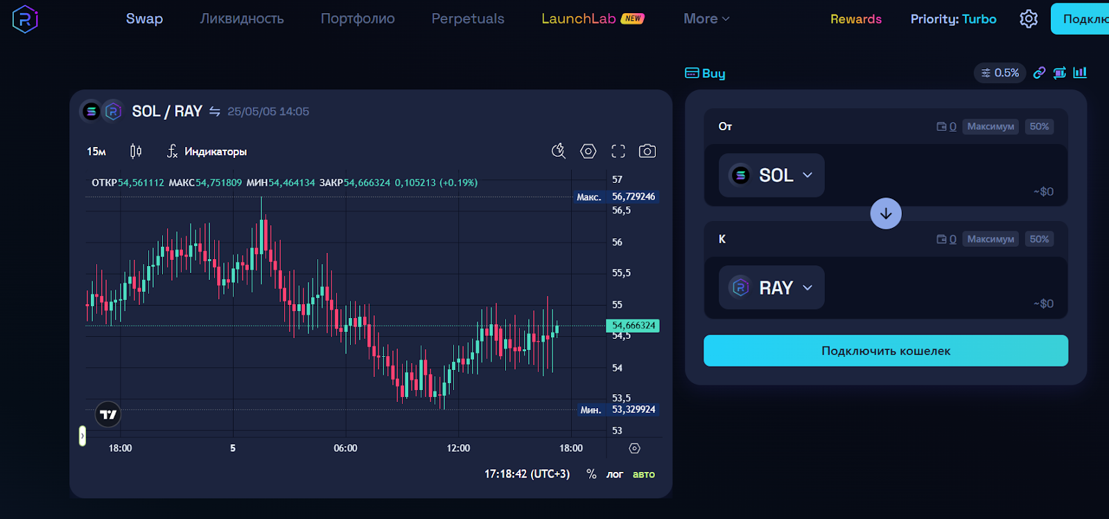 Для передачи пользователям вознаграждений используется нативный токен RAY. По информации с CoinMarketCap, он торгуется на 170 биржах, что может говорить о надежности и ликвидности монеты. Рыночная капитализация превышает 750 млн долларов, а суточный объем торгов составляет 32 млн. Всего доступно 555 млн RAY, а токен в начале мая 2025 года стоит примерно 2,64 доллара.Несложно понять, как пользоваться биржей Raydium, особенно тем, кто уже работал на подобных площадках. Чтобы совершать обмен, нужно подключить кошелек и выбрать торговую пару. Можно настроить допустимое проскальзывание цены. Если курс изменится, позиция будет отменена. После этого достаточно выставить ордер и совершить обмен.