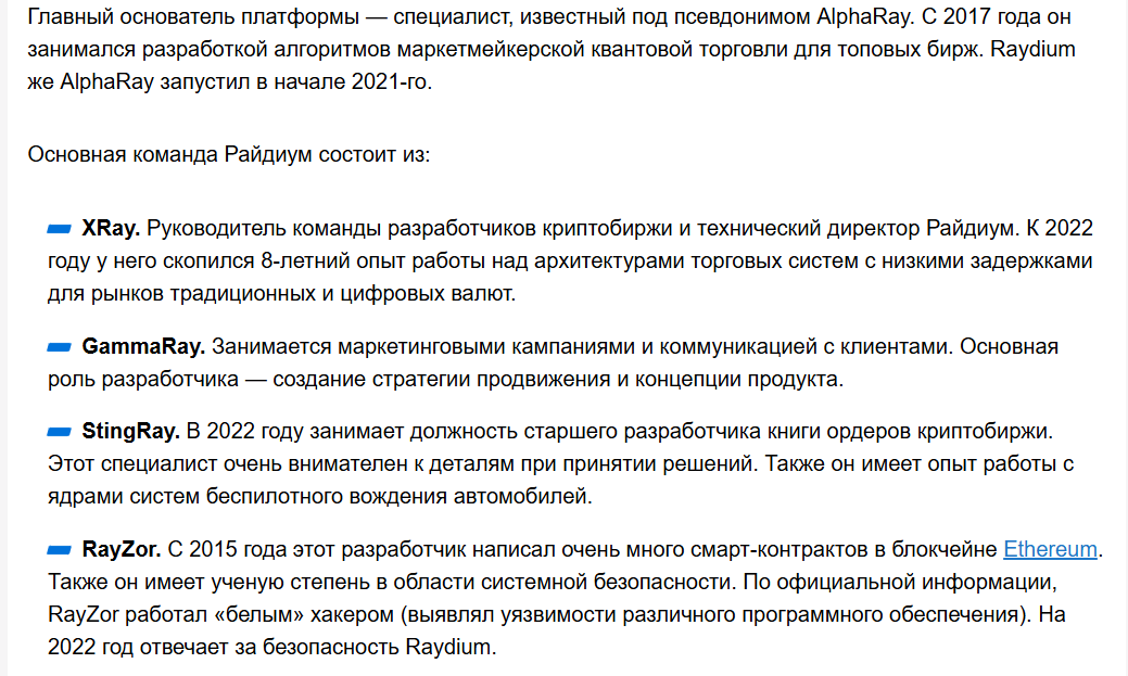 Биржу «Рейдиум» создали в 2021 году, но даже в 2025 основатели не раскрывают своих личных данных. Это вполне обычная ситуация на рынке децентрализованных финансов. На сайте crypto ru написано, что главный разработчик занимается созданием алгоритмов для бирж с 2017 года. Также в команде есть человек, который работал белым хакером, а с 2015 года написал кучу смарт-контрактов.