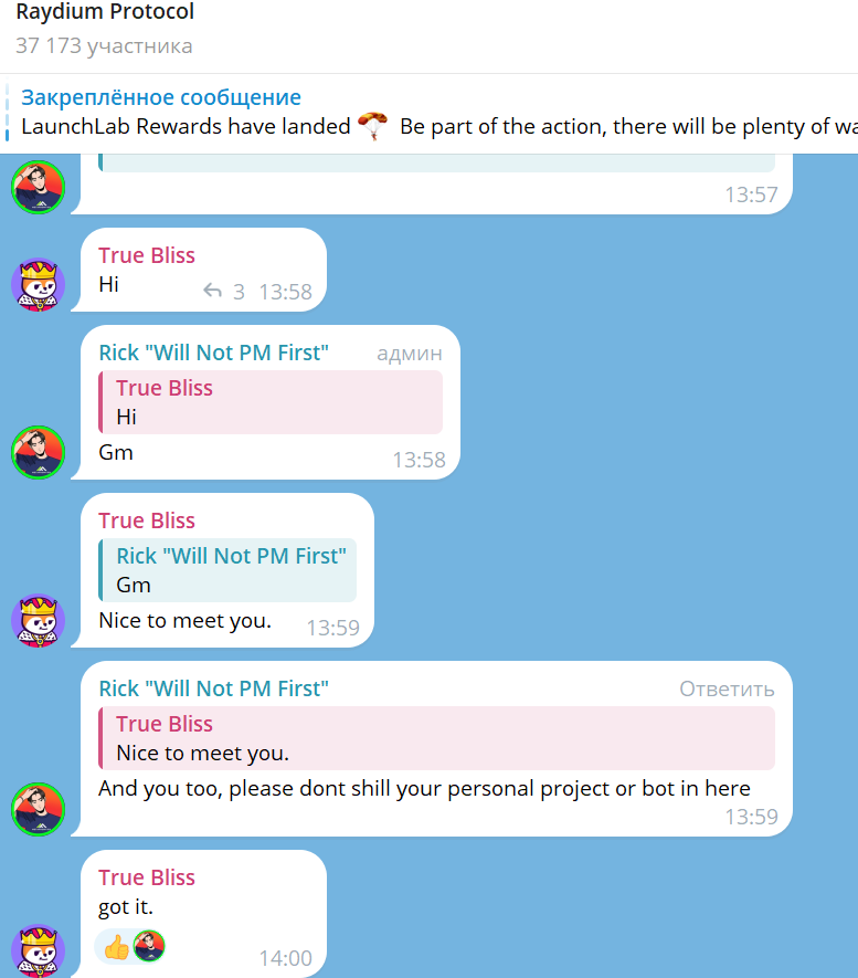 Разработчики площадки ведут аккаунт в Х (Твиттер) @RaydiumProtocol, который читают более 400 тыс пользователей. Посты набирают разное количество просмотров: от 5 до 80 тыс. Также у проекта есть группа в Телеграме, где 37 тыс участников. Ничего полезного в ней не пишут, а пользователи в основном просто здороваются.