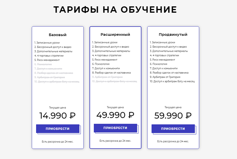 Тариф Базовый стоит 14 990 рублей. Он подойдет для новичков. Что касается тарифных планов для продвинутых, то они стоят 49 900 рублей и 59 900 рублей, в зависимости от наполнения.