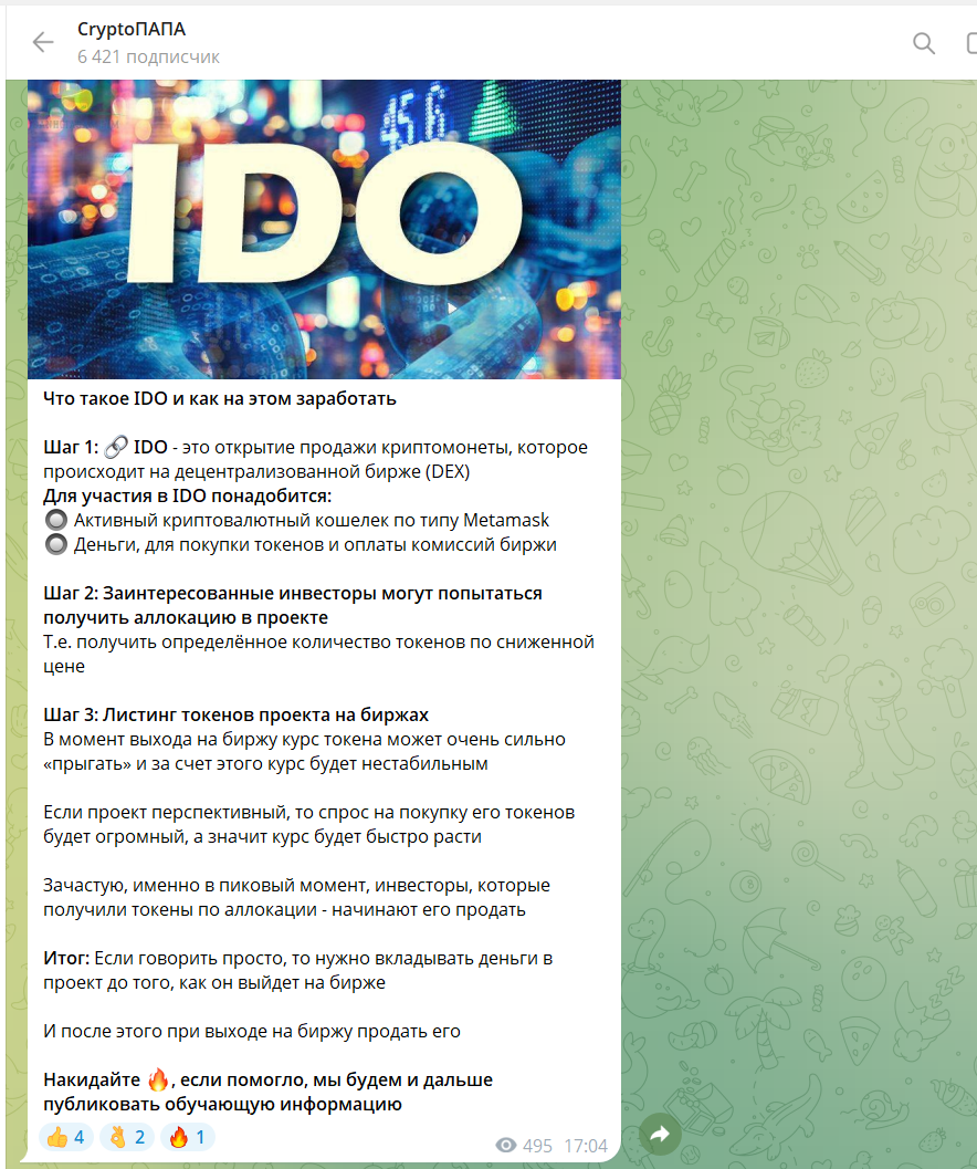 «Криптопапа» – паблик в ТГ для тех, кто зарабатывает на крипте. Есть материалы для новичков: базовая информация для новичков. Также есть рекомендации, прогнозы, новости, обзоры монет. Нам захотелось понять, не лохотрон ли это.