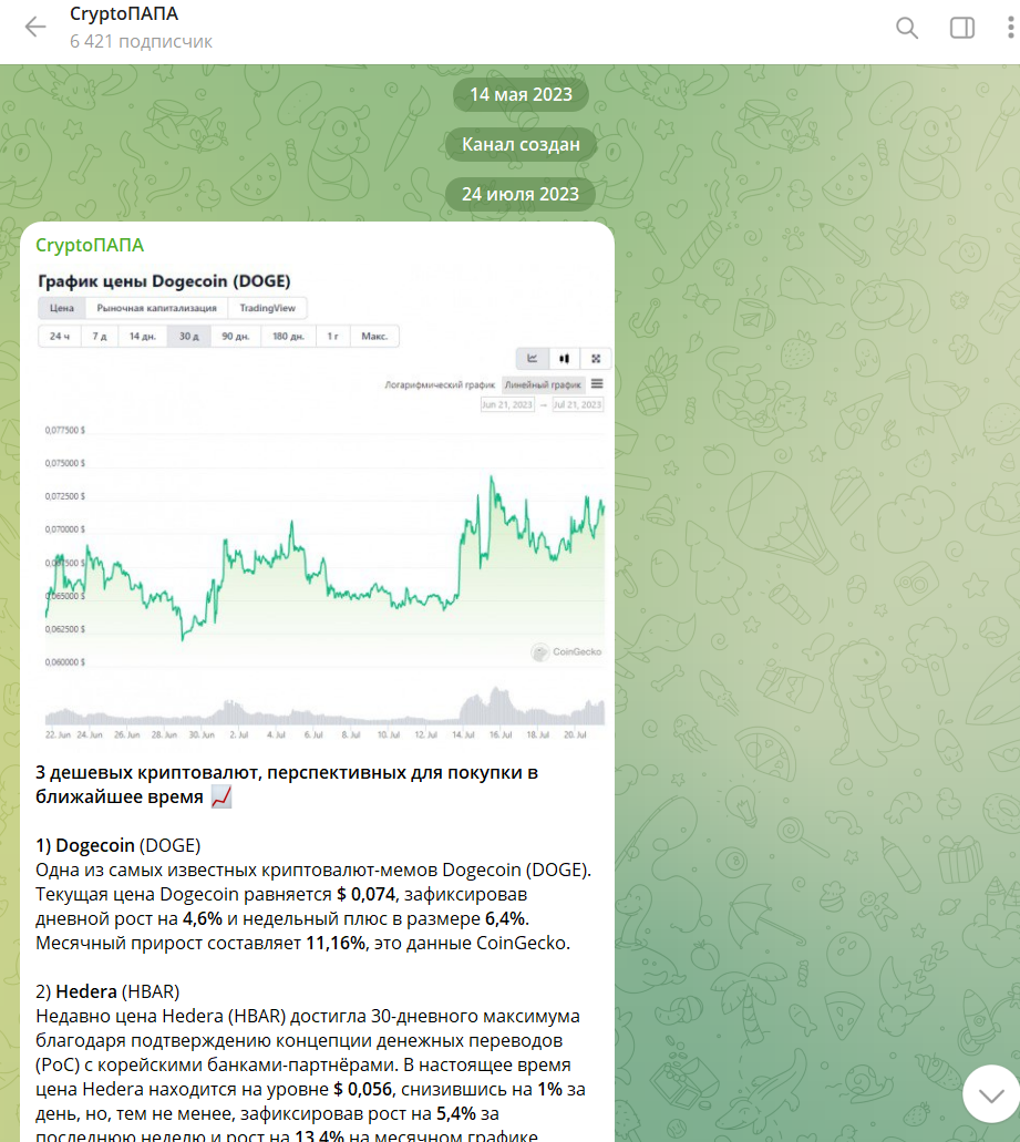 Канал создан в мае 2023 года, спустя 2 месяца вышла первая публикация: пост о перспективных дешевых криптовалютах. Кое-что настораживает. Например, автор ничего не рассказывает о себе.