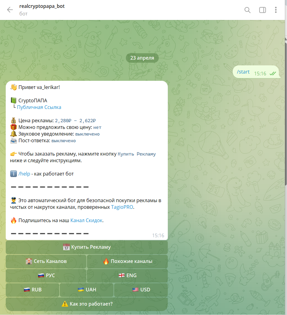 Vperedcpecney не предлагает индивидуальное сопровождение сделок, курсы, участие в торговых сессиях или подписку на свой закрытый канал. Он зарабатывает только на рекламе. Узнать все подробности и оформить сотрудничество можно через realcryptopapa bot и сторонние сервисы.