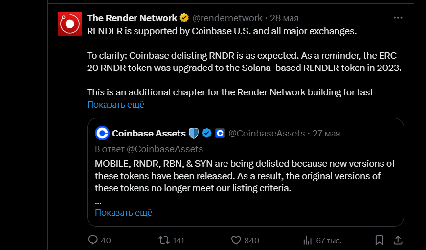 Среди основных перспектив можно выделить участие проекта не только в рендеринге, но и в развитии ИИ, который требует больших мощностей. Последние новости о криптовалюте Render Network Crypto Rndr Coin в мае 2025 года говорят о том, что монета «Рендер Рндр Коин» упала на 8% из-за неправильной информации о делистинге, когда биржа Coinbase удаляла старый тикер.
