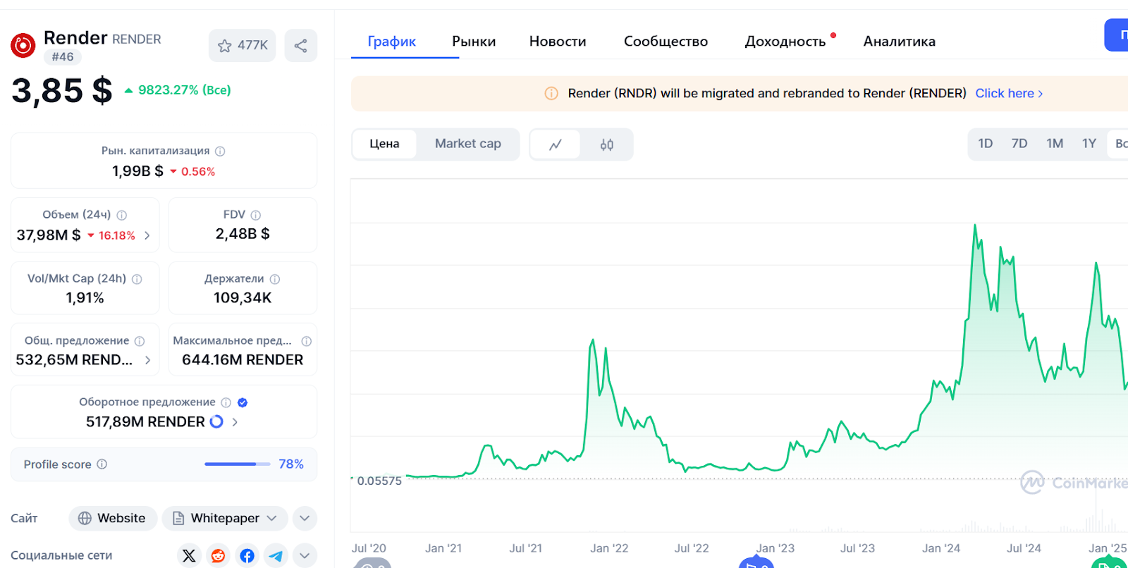 Раньше Rndr базировался только на Etherium, но после перехода на Solana в 2024 году поменял название на Render. По информации с CoinMarketCap, в июне 2025 года токен торгуется в районе $4, хотя по графику видно, что большую часть времени цена оставалась достаточно стабильной. Капитализация проекта превышает два миллиарда долларов, а суточный объем составляет 38 миллионов, причем количество держателей достигает 110 000, поэтому видно, что токен популярен.