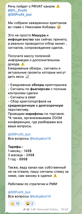 На телеграмм-канале удается найти коммерческое предложение Николая Кобзыря. Он приглашал своих подписчиков покупать доступ в платный аккаунт.