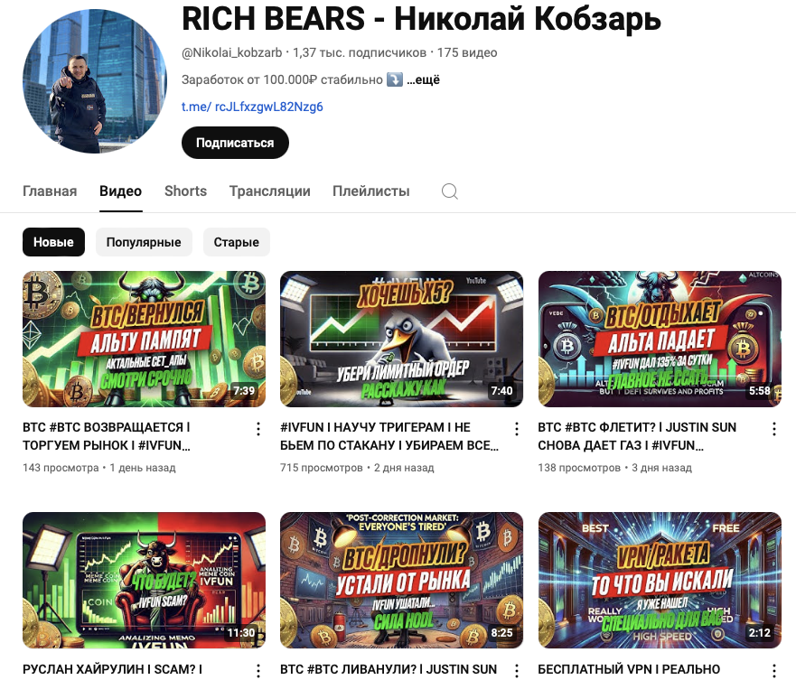 У автора было несколько каналов. И один из них, riiikz уже недоступен. Тем, не менее, другой, «Rich Bears Николай Кобзарь», Nikolai Kobzarb до сих пор существует и довольно активно ведется.