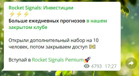 Rocket signals telegram — это канал, специализирующийся на трейдинге. Ранее здесь было доступно множество биржевых новостей, информации о разного рода привлекательных для трейдеров компаниях, а также сигналов. Прогнозы авторы предоставляли как бесплатно, так и за деньги. Канал предоставлял платную поддержку и обучение трейдингу. Сегодня к каналу имеется много вопросов, которые и будут представлены в обзоре далее.