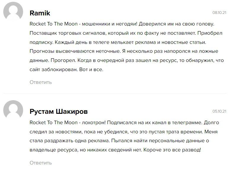 Оставьте свой комментарий о Rockettothemoon инвестиции. Наши проверки помогают не стать жертвой обмана, читайте их.