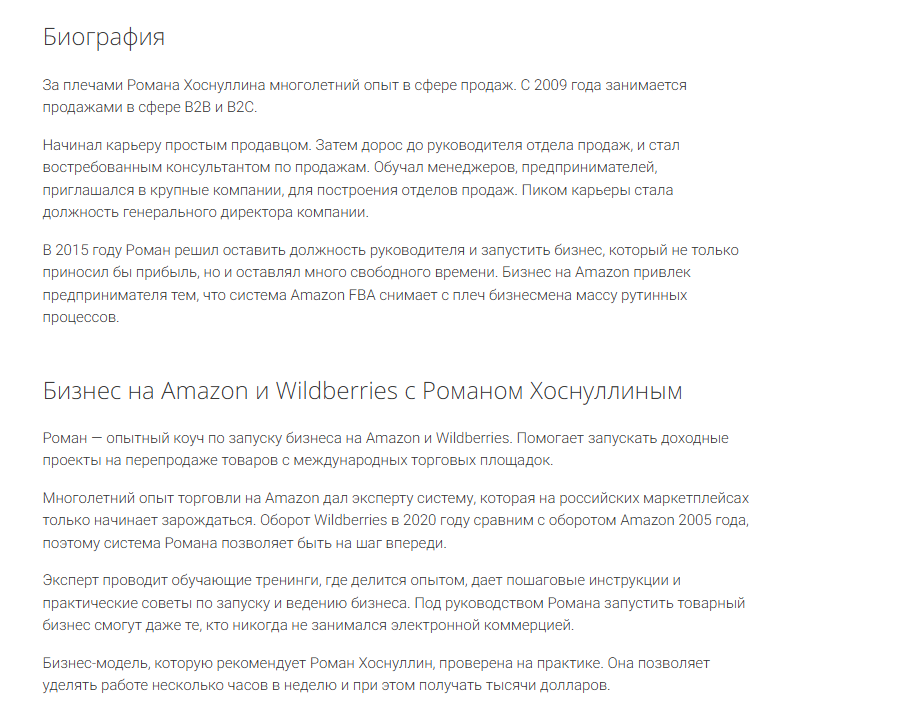 Роман Хоснуллин обещают пошаговые инструкции, запуск с нуля, выход на доход ₽300,000 за 90 дней – благодаря якобы инструментам автоматизации, а также использованию опыта американского селлинга. При этом бизнесмен не демонстрирует аудитории достоверную статистику по прибыли и прочие доказательства заявленной успешности.