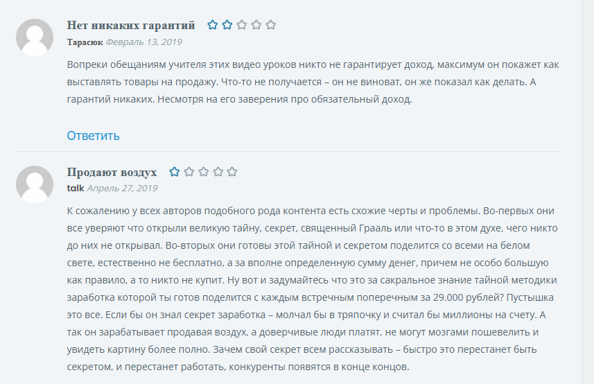 - негативные отзывы указывают на бесполезность курсов и отсутствие финансовых гарантий;