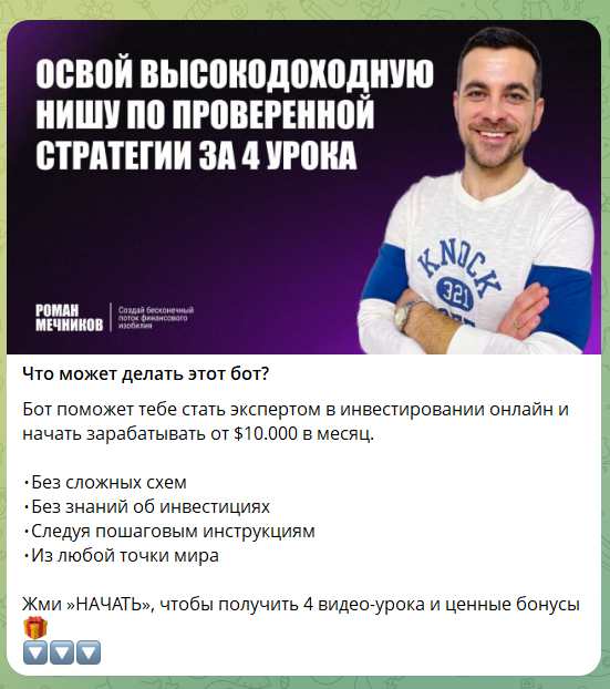 «Генератор прибыли» – это телеграм-бот, автором которого является трейдер Роман Мечников. В рамках проекта участники получают доступ к бесплатным урокам и различным бонусам. Они помогут погрузиться в процесс инвестирования и выйти на доход. На старте не требуется никаких знаний, только точное следование инструкции Романа.