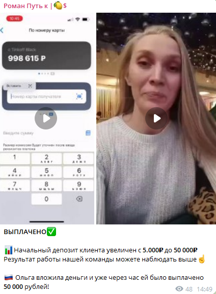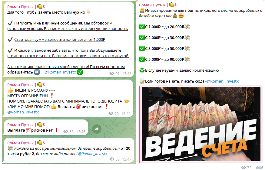 Создатель финансового проекта «Роман | Путь к миллиону» в Телеграмм предлагает подписчикам зарабатывать деньги за счет совместной торговли. Он продвигает платную услугу, связанную с управлением депозитами, и обещает, что никто из его клиентов не столкнется с рисками и убытками. Основной способ заработка – торговля криптой на арбитраже. Для сотрудничества клиенты должны написать в лс Роману, ознакомиться с доступными вариантами вложений, перевести деньги трейдеру и ждать, пока он вернется с прибылью.