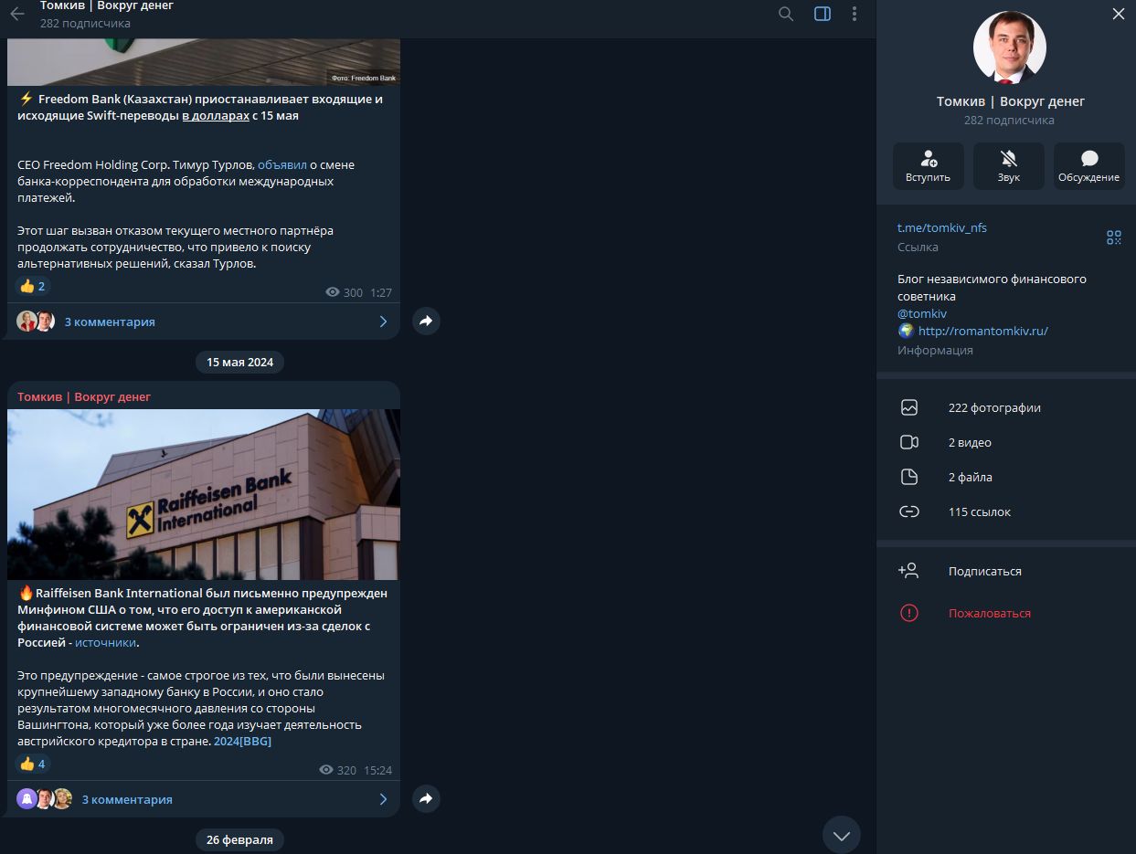 - телеграм-сообщество «Томкив | Вокруг денег» (tomkiv nfs) создано в 2016 году. На канал подписано 282 пользователя, а просмотры постов иногда превышают численность. Можно сделать вывод, что контент «Томкив | Вокруг денег» интересен большинству подписчиков.