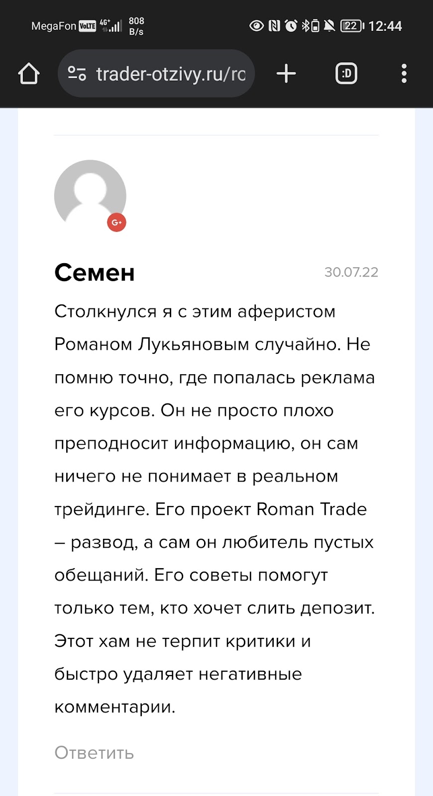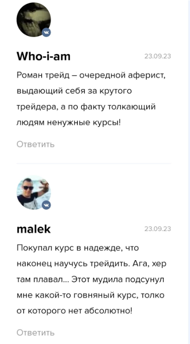 Семён сообщает, что трейдер любитель пустых обещаний и сам вообще-то в трейдинге ничего не понимает. Более того, оставивший отзыв упоминает, что Роман удаляет все рецензии, которые ему не понравились, то есть все негативные отзывы. Вероятно, именно поэтому на его сайте можно найти исключительно положительные мнения о его проекте.