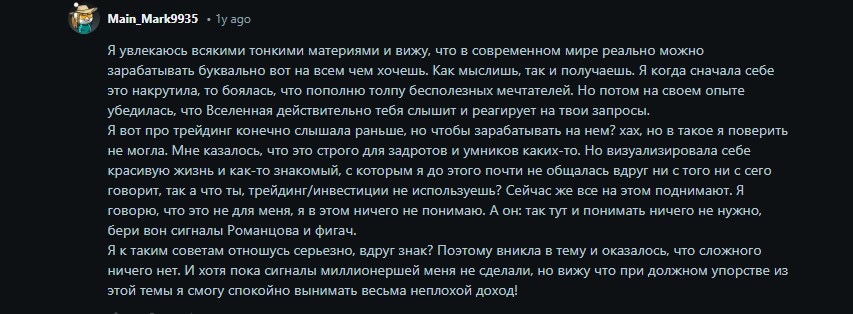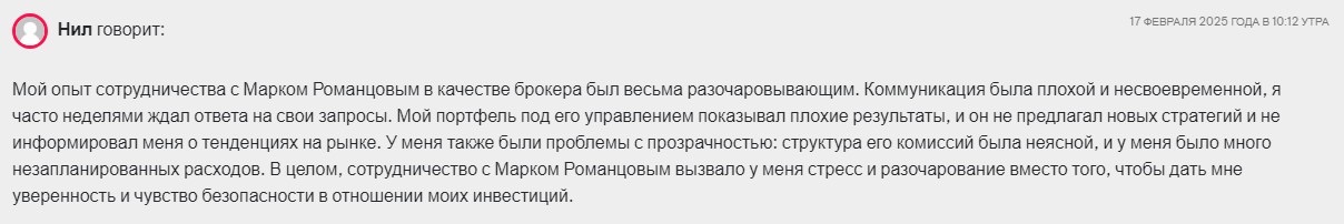 Более конструктивный негативный комментарий создает впечатление о Романцове как о неоднозначном инвесторе. Это вызывает сомнения в пользе сотрудничества с трейдером.