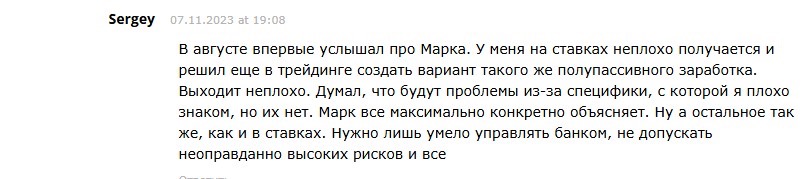 Негативный отклик выглядит более детальным. Указывается некачественная коммуникация. Так, ответы от трейдеры могли приходить неделями, теряя актуальность. Пользователи пишет, что под руководством Марка ушел в минус. Также отмечается отсутствие прозрачности в оплате, что приводило к дополнительным тратам.