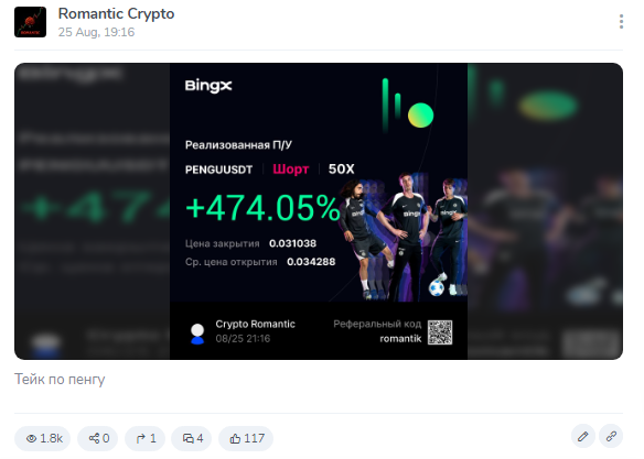 На ТГК Romantic Crypto регулярно публикуются сигналы с реферальными ссылками.