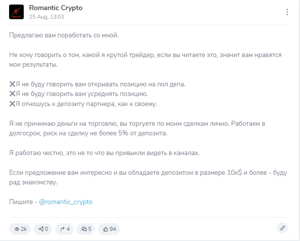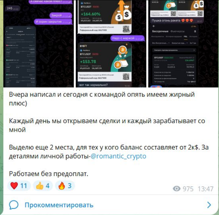 Основатель тг-сообщества «Романтик Крипто» предлагает подписчикам повторять свои успехи в crypto трейдинге. Он предоставляет людям сигналы, которые якобы в торговле на рынке приводят к результатам со знаком «плюс». Мы решили выяснить, можно ли доверять этому персонажу Телеграма.