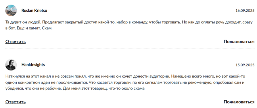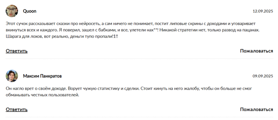 Пользователи оставляют в сообществе «Рост 0 100 Новогодний старт» негативные комментарии. По их словам, автор канала постоянно призывает к сотрудничеству и зачислению депозита на счет биржи-партнера. Также он обещает большую прибыль, но никаких подтверждений не предоставляет. Пользователи рискуют потерять деньги, а если захочется вернуть средства, их блокируют. Трейдеры называют автора сообщества мошенником.