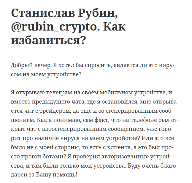 Как таковых отзывов о проекте Rubin Trade в сети мы не нашли. Зато есть жалобы и подозрения, что проект продвигается при помощи вирусов или ботов. Пользователи жалуются, что при открытии приложения Телеграм у них сразу же открывается чат с Рубиным с уже написанным сообщением. Многие не могут от этого избавиться и спрашивают совета, как это сделать. Ни одного положительного комментария от пользователей о торговле в партнерстве со Станиславом мы в интернете не нашли.