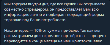 О стоимости индивидуального сопровождения в сделках автор в открытом доступе ничего не говорит, да и в принципе никаких цифр не озвучивает. Поэтому мы написали ему в личку, чтобы узнать условия подробнее. Трейдер сообщил, что торговля ведется внутри дня. То есть под его руководством совершаются краткосрочные сделки на коротких временных периодах. Заранее трейдеру ничего оплачивать не нужно. Оплату он получает по итогу отработанного месяца. Стоимость его услуг составляет 10% от полученной пользователей прибыли. Процент совсем небольшой, что производит благоприятное впечатление.Однако, со временем становится понятно, что основная цель автора в данном случае – убедить клиента зарегистрироваться на платформе и внести на нее депозит. Очевидно, автор зарабатывает на реферальной программе, а потому качество сделок его на самом деле не интересует. Поскольку нигде в ленте трейдер ни одной торговой платформы не упоминает, есть подозрение, что пользователям он дает различные фальшивые площадки для регистрации. На них, как правило, торговля просто имитируется, и клиент в любом случае теряет все деньги.