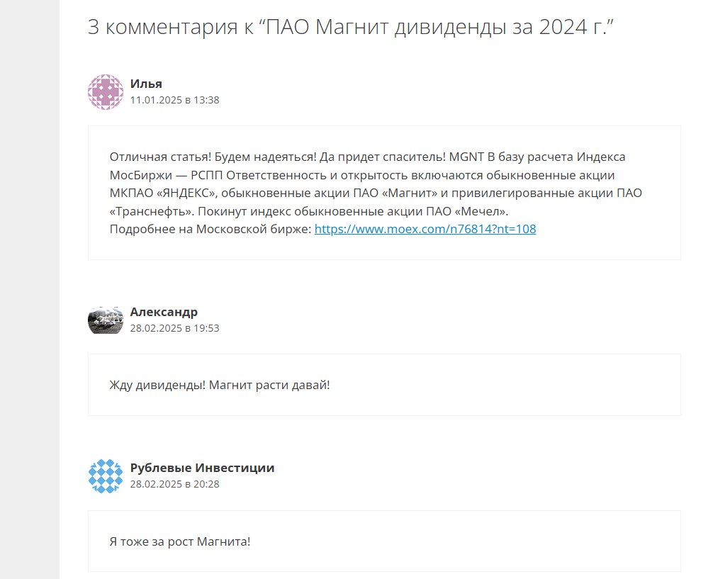 В сети нет независимых отзывов о создателе канала — ни в соцсетях, ни на инвестиционных форумах. Единственные комментарии найдены на самом сайте под статьями, и они крайне лаконичны и позитивны (“Полезная информация!”, “Жду дивиденды!”).