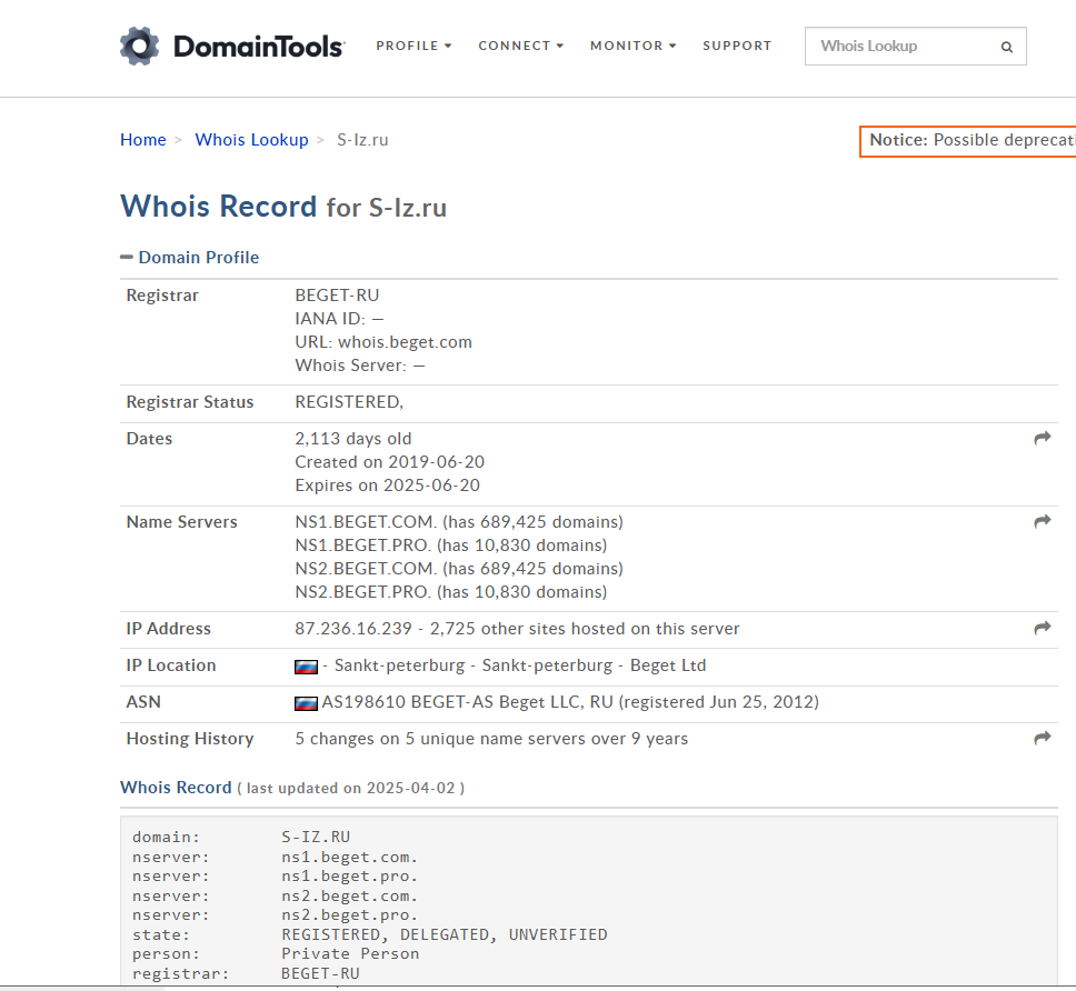 Хостинг (Beget, Россия) и домен (регистратор скрыт) тоже не вызывают доверия — типичный вариант для полуанонимного проекта.