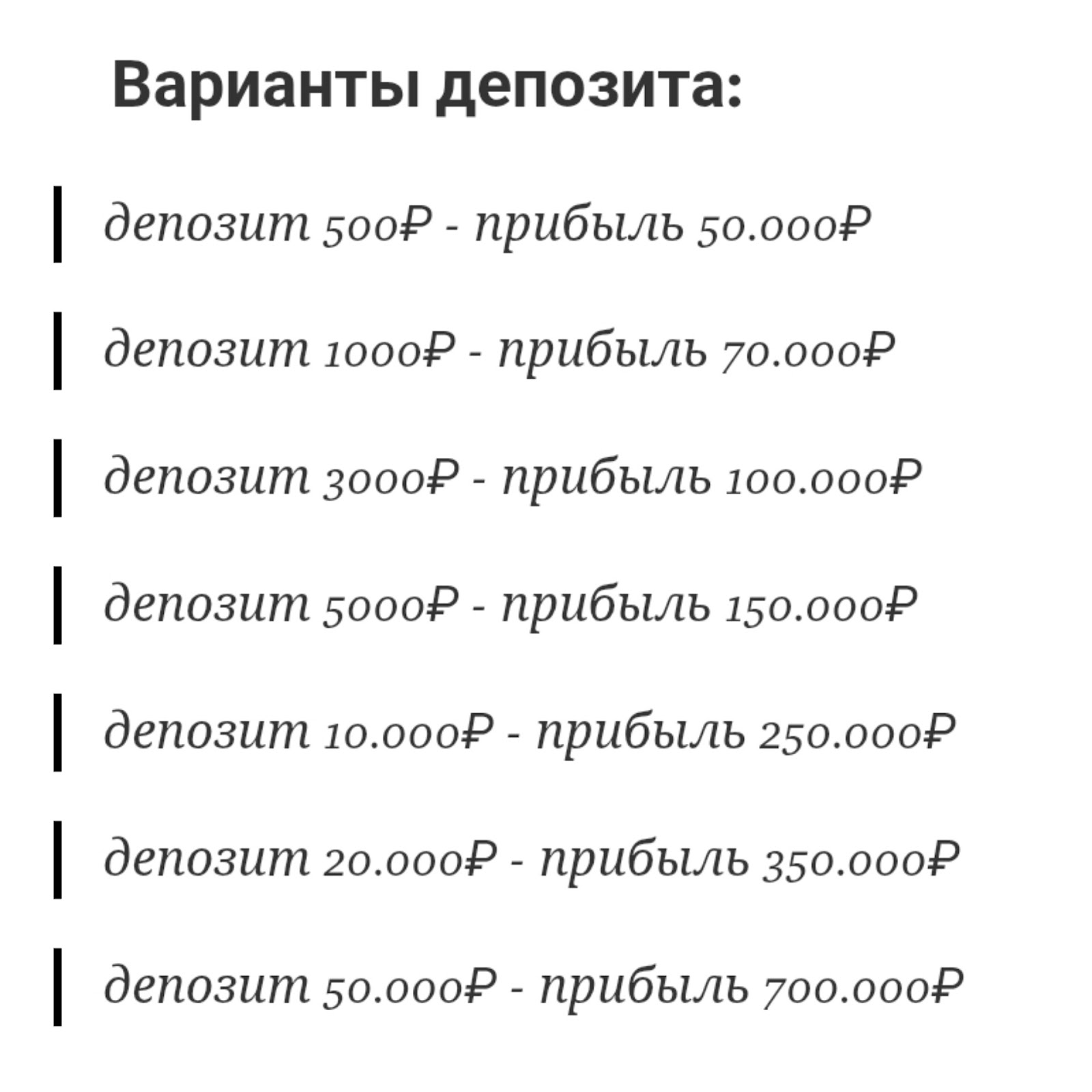 - вложение 500 р. — заработок якобы будет 50 т. р.;