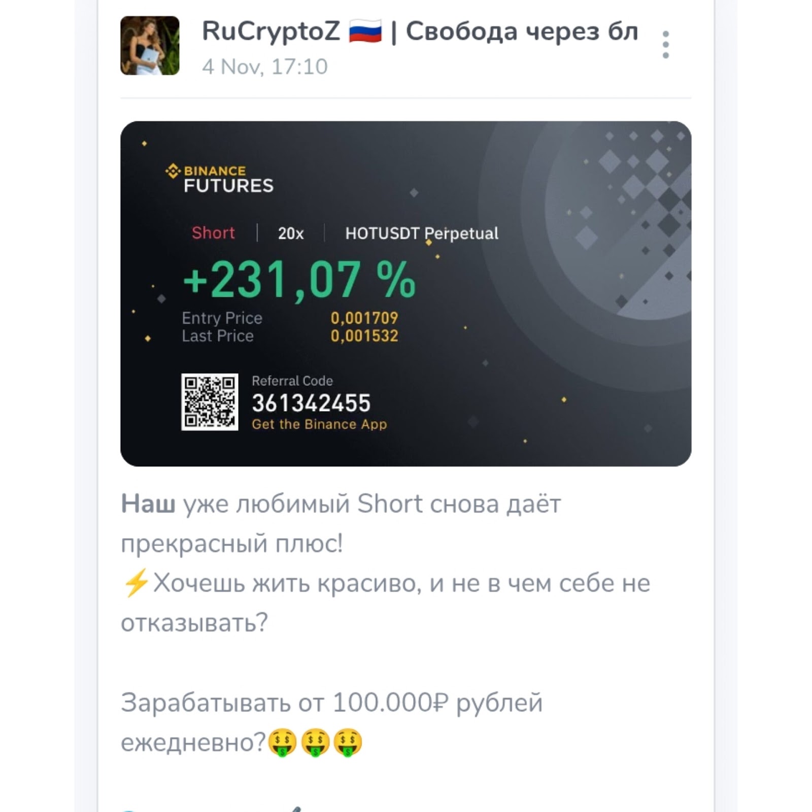 Таким способом владелец тгк RuCryptoZ привлекает партнеров и может получать заработок на их минусовых сделках. Своих верифицированных отчетов по торговле предпочла не демонстрировать.