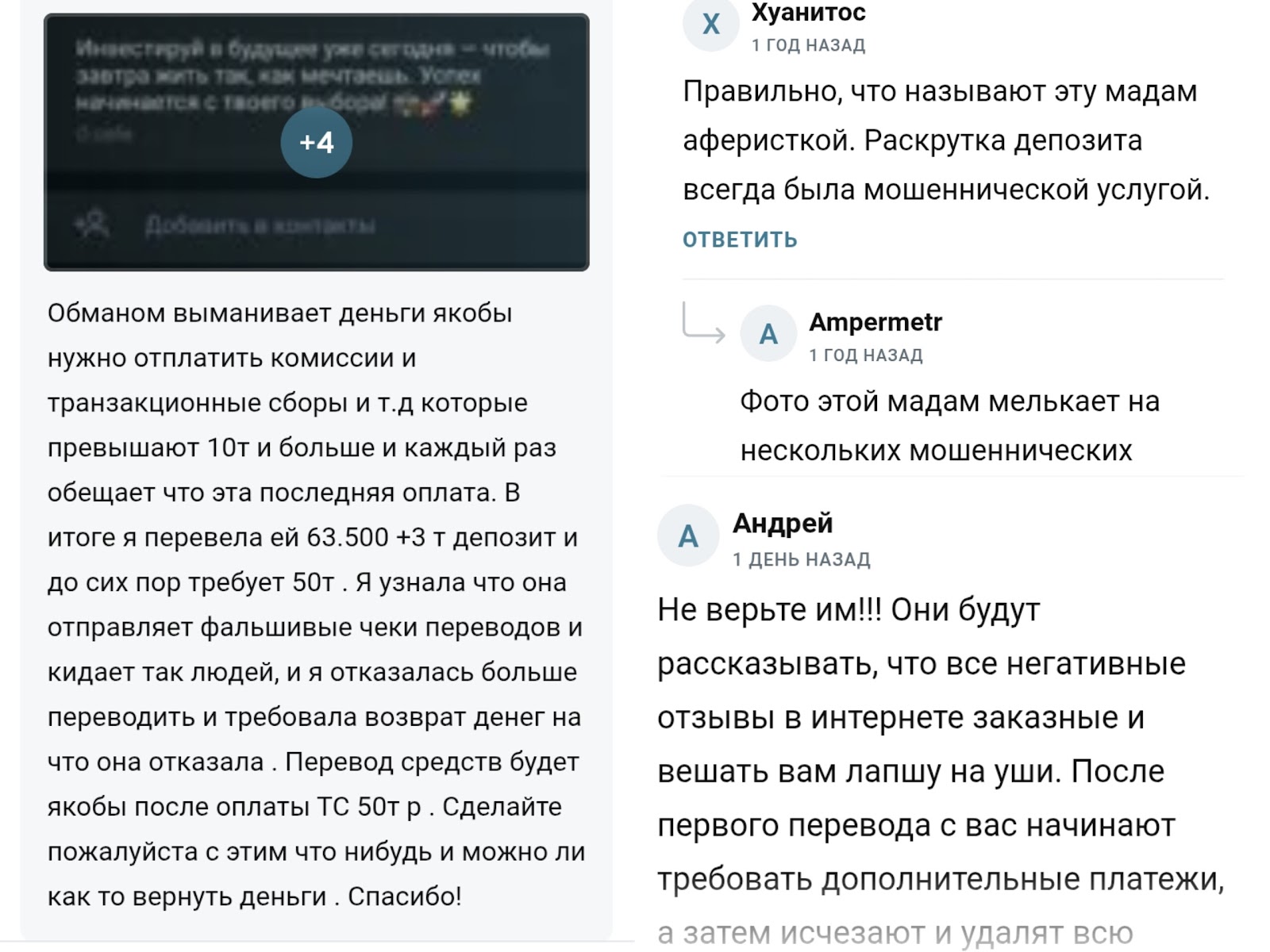 Создатель рассматриваемого Телеграмм канала использует чужие фотографии и не доказывает экспертности в инвестировании. Виктория занимается продвижением партнерских ссылок для криптовалютных бирж, и, судя по отзывам, регулярно требует вносить дополнительные платежи. Из ключевых фактов мы также выделили: